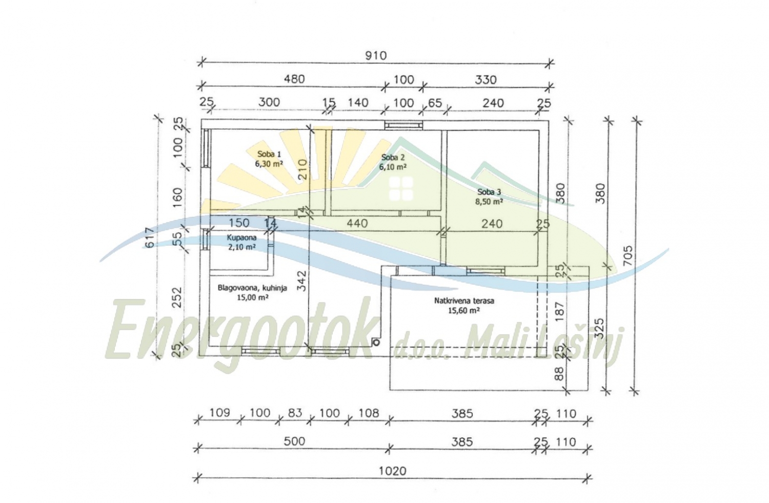 Dimensione: Casa 46 m², terrazza 16 m², ripostiglio 9 m², cortile 1936 m²